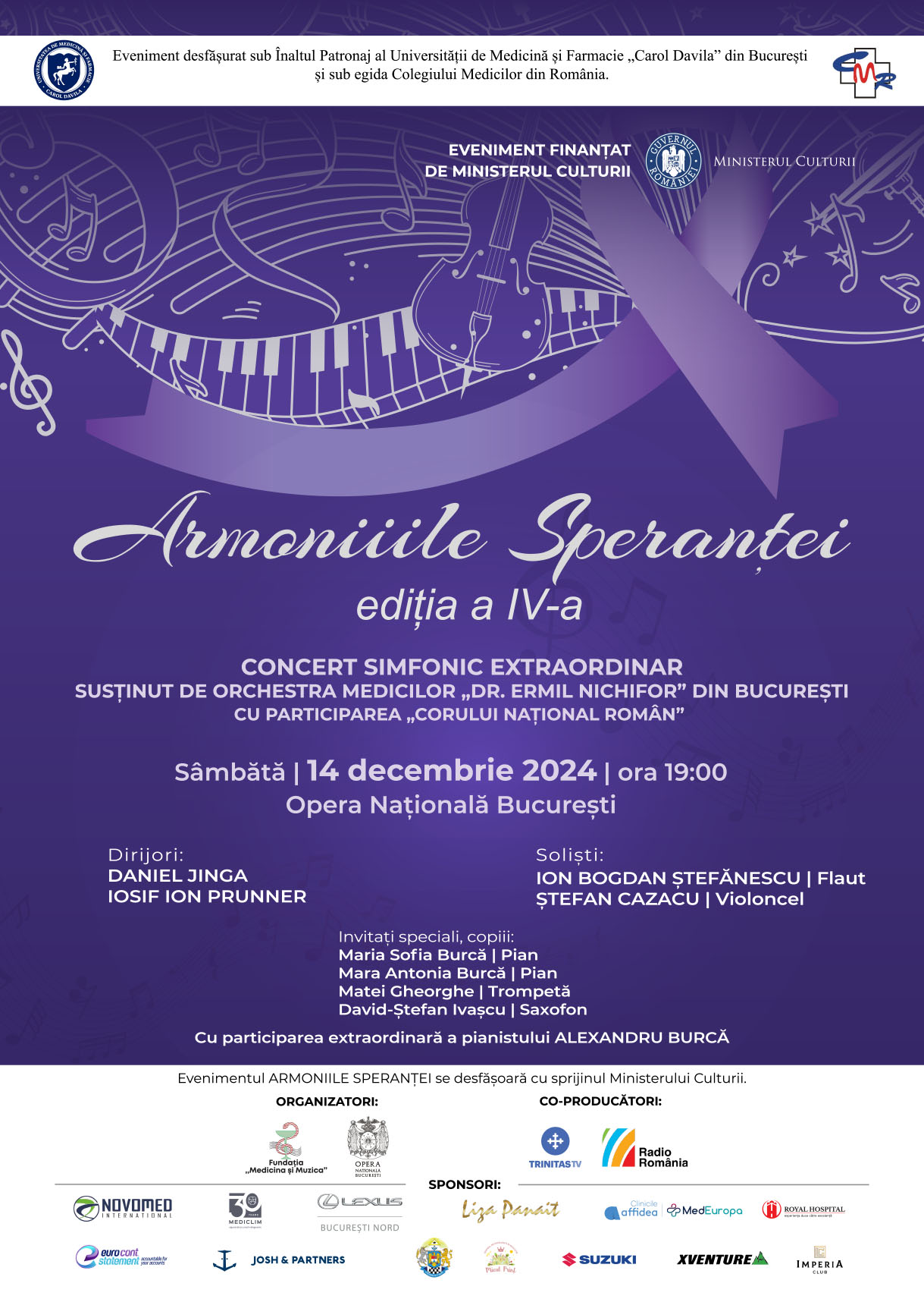 In anul 2025, pe 6 decembrie, pe scena Ateneului Roman a avut loc cea de a V-a editie a Concertului Extraordinar ARMONIILE SPERANTEI unde s-au reunit medici muzicieni din numeroase centre universitare ale tarii sub egida Orchestrei Medicilor din Romania, continuand traditia de a uni lumea medicala prin muzica in sprijinul cauzelor umanitare.